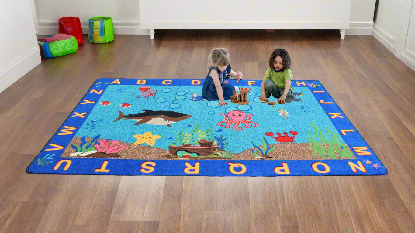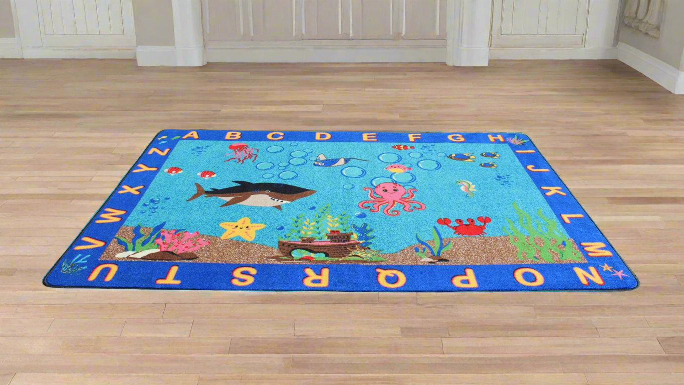 All the Fish in The Sea classroom Rug! This great ocean theme is a great addition to any daycare or classroom. Let your imagination take you deep into the ocean and see what you can find in there. This 6x9 classroom rug is a great tool for teachers. Fun underwater sea creatures and the vibrant colors make this rug a must have for your classroom or play area. Made from soft nylon yarn and made to last and stand up to heavy foot traffic. Proudly made in the USA.