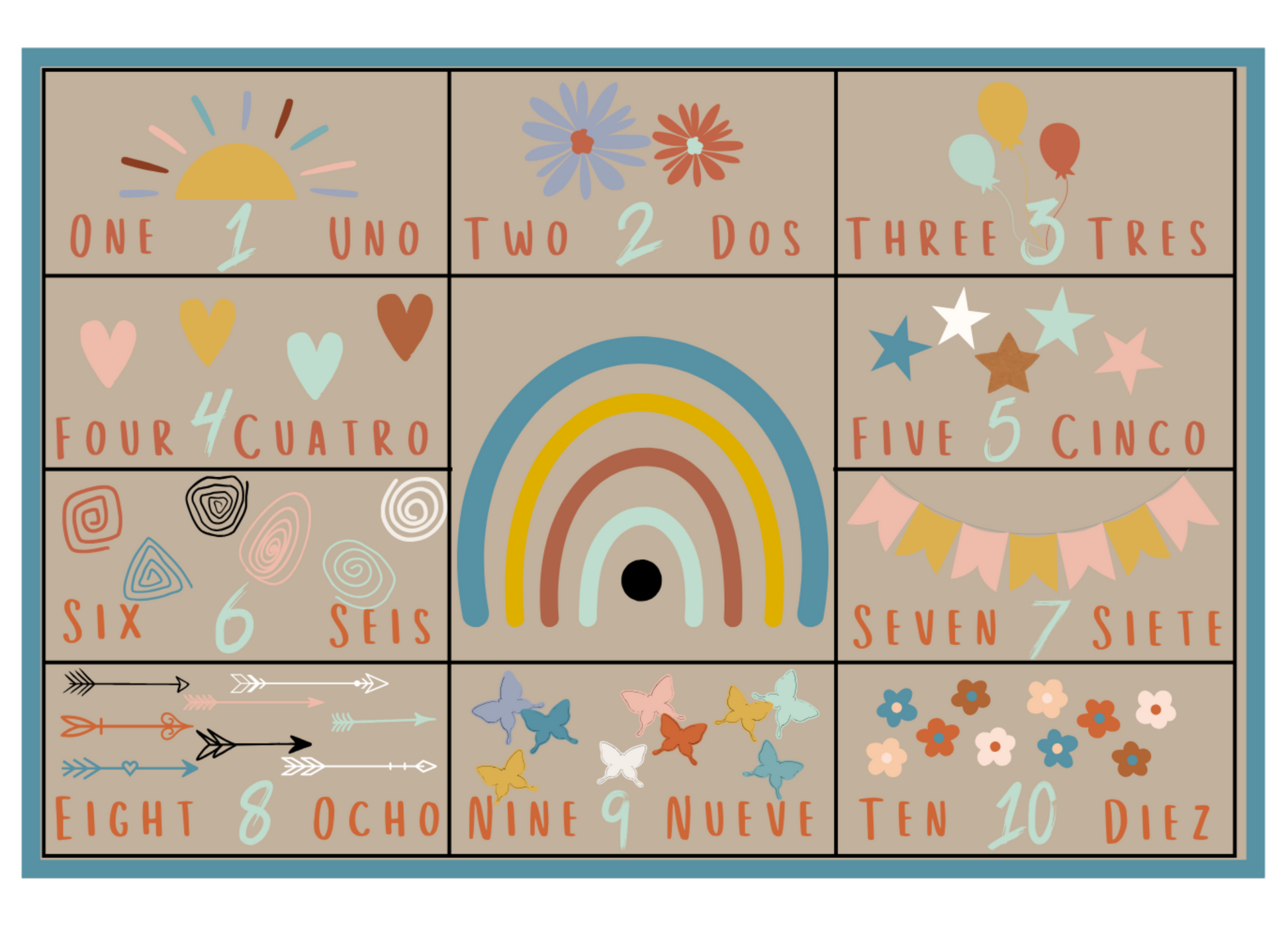Made from durable materials, the Bilingual Boho Counting 5' x 8' rug is perfect for circle time, quiet reading moments, or interactive learning sessions. The bilingual numbers and patterns help children learn Spanish in a unique and calming atmosphere.