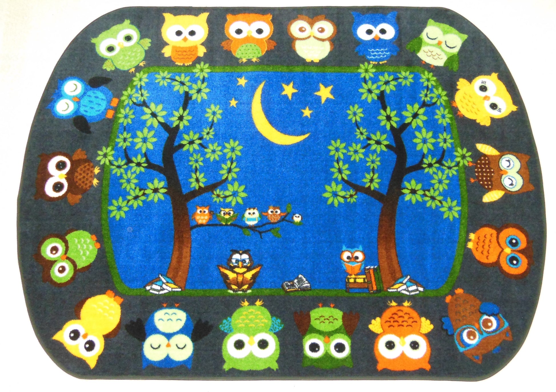 Story Time Owls Rug (6'6 x 8'4 - K2053) - The Owls are ready for reading time! This rug is a great addition to a reading area or circle time. This owl seating rug is designed for 18 children. Made from soft, durable nylon carpet.